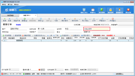 ????參數保存完成后,返回銷售訂單管理界面,新增銷售訂單,自定義編號可以直接輸入。