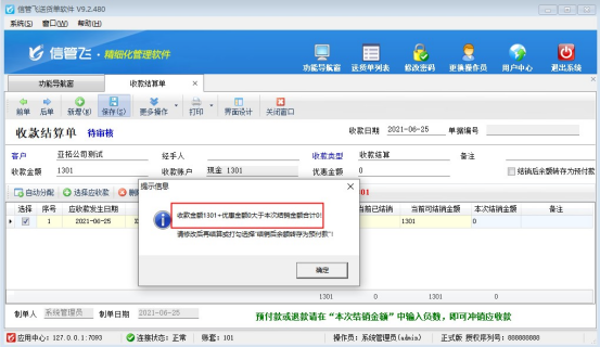 ????一、保存時提示“收款金額+優(yōu)惠金額大于本次結(jié)銷金額合計”,無法保存。如下圖所示: