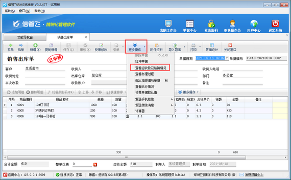 ????信管飛RMS是進銷存一體化的軟件,支持管理往來應收應付款,銷售出庫單審核后自動生成銷售應收款信息,可以對銷售應收款進行收款結(jié)算,如銷售應收款已結(jié)銷的情況下,發(fā)現(xiàn)銷售出庫單有填開錯誤,需要修改,系統(tǒng)默認是不能直接進行反審修改操作,如下圖所示。
