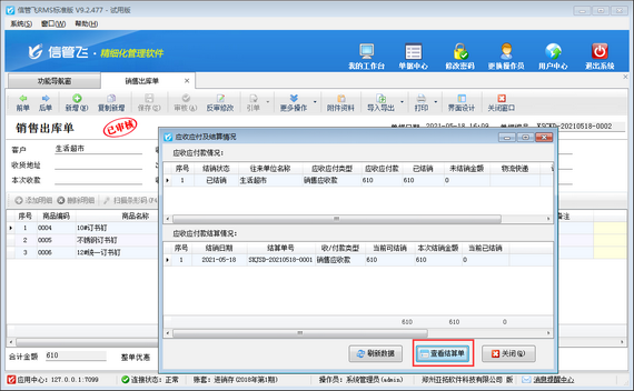 ????信管飛系列下的送貨單軟件、RMS進銷存軟件等都支持開銷售單和管理銷售單生成的對應應收款,如存在客戶付款小于此客戶的應收賬款時,軟件中該如何對此應收款進行結(jié)銷?本文以“信管飛RMS軟件”為例,示范下如何結(jié)算。
