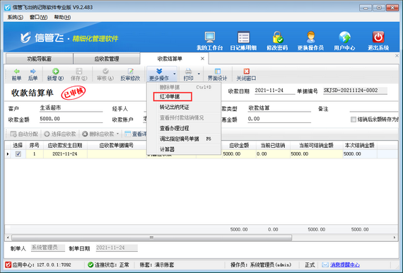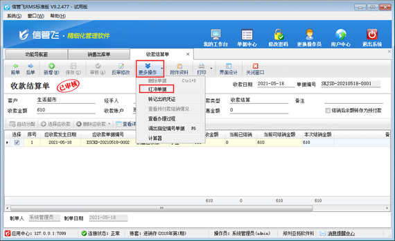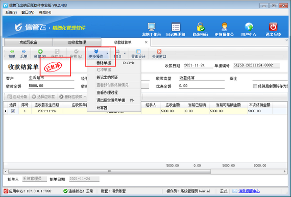 ????然后在收款結(jié)算單界面點擊“更多操作”—》“紅沖單據(jù)”,如下圖所示,單據(jù)紅沖后,點擊“更多操作”—》“刪除按鈕”,即可刪除收款結(jié)算單。