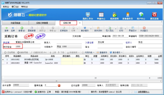 ????本文以方式①為例,在功能導航窗點擊“采購管理”—》“采購訂單”,在采購訂單管理界面點擊新增,進入采購訂單界面,在預付定金處輸入預付款(預付1000元),如下圖所示: