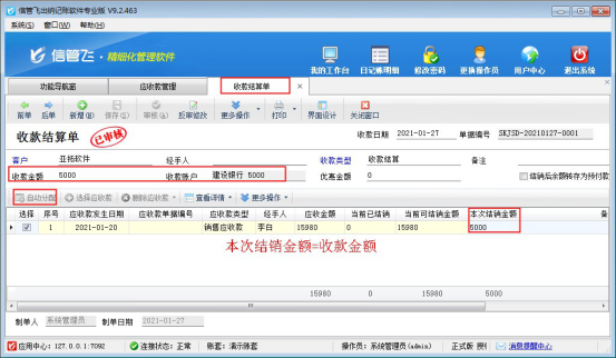 ????在收款結(jié)算單界面,默認是獲取此客戶所有未結(jié)銷的應收款。收款金額輸入本次收款5000元,然后點擊“自動分配”,可把收款金額分配到本次結(jié)銷金額明細中。分配完成后點擊保存并審核結(jié)算單。則本次收款完成,如下圖所示: