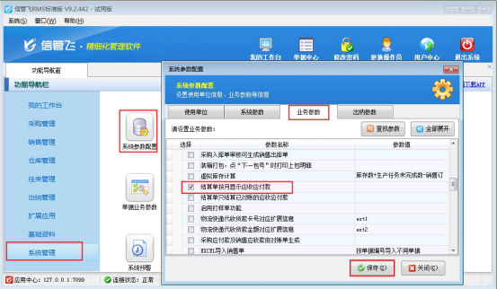 ????在功能導航窗點擊“系統(tǒng)管理”—》“系統(tǒng)參數(shù)配置”選擇“業(yè)務參數(shù)”,勾選“特殊功能數(shù)”下的“結(jié)算單按月顯示應收應付款”,然后保存設置,如下圖所示:
