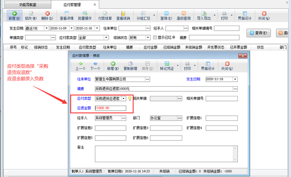 ????在功能導航窗點擊“往來管理”—》“應付款管理”,即可打開應付款管理界面,在工具欄點擊“新增”按鈕,系統(tǒng)打開新增應付款窗口,如下圖所示,“應付類型”選擇為“采購退貨應退款”,然后錄入應退金額及其他數(shù)據(jù)后保存此應付款信息即可。