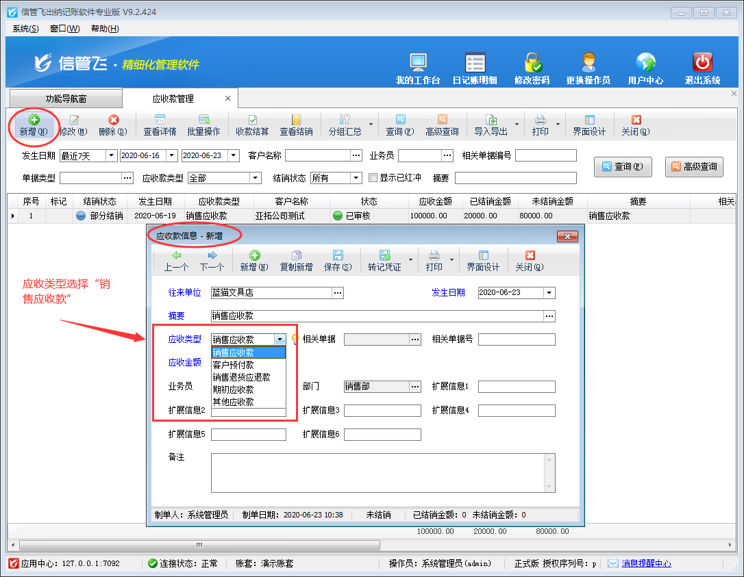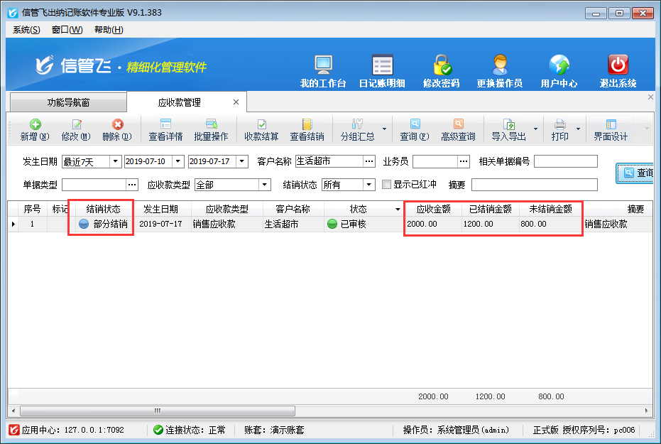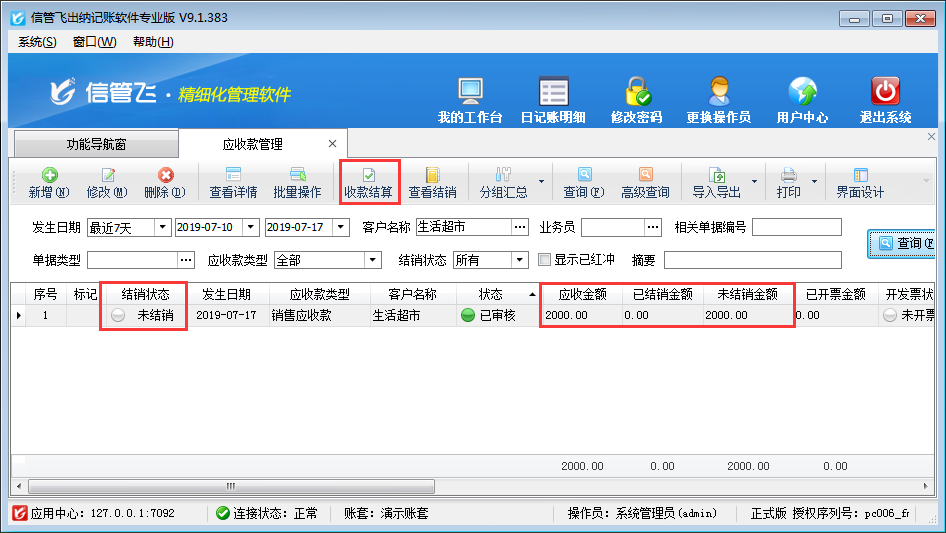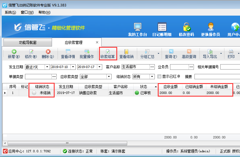 ????在功能導航窗點擊“往來管理”—》“應收款管理”打開應收款管理界面新增一條應收款記錄,如下圖所示,客戶“生活超市”應收金額為2000元,已結(jié)銷金額為0。