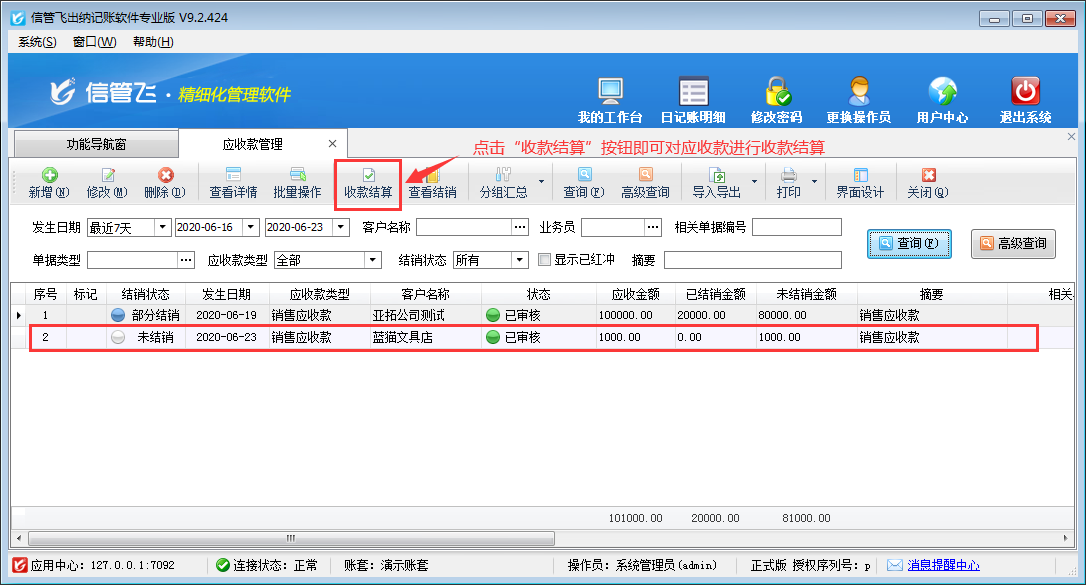 ????信管飛出納記賬軟件可登記客戶和供應商的應收應付款記錄,對于用戶出現(xiàn)部分收款的情況,軟件中如何處理?本文以“信管飛出納記賬軟件”為例進行示范下如何部分結(jié)銷應收款?