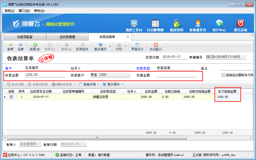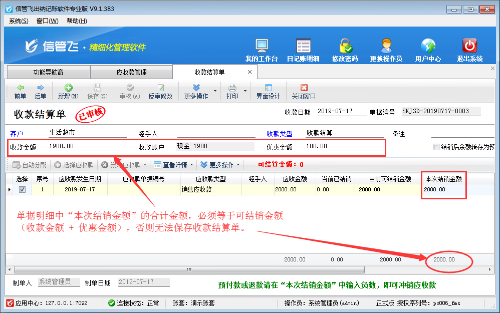 ????注意:收款結(jié)算單單據(jù)明細中“本次結(jié)銷金額”的合計金額,必須等于可結(jié)銷金額(收款金額 + 優(yōu)惠金額),否則無法保存收款結(jié)算單。