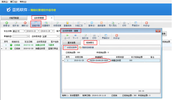 ????在功能導航窗點擊“往來管理”—》“應收款管理”可以查看到當前未結(jié)銷的應收款,選擇示例客戶“亞拓軟件測試”點擊工具欄的“收款結(jié)算”按鈕,會進入收款結(jié)算單界面,如下圖1所示:
