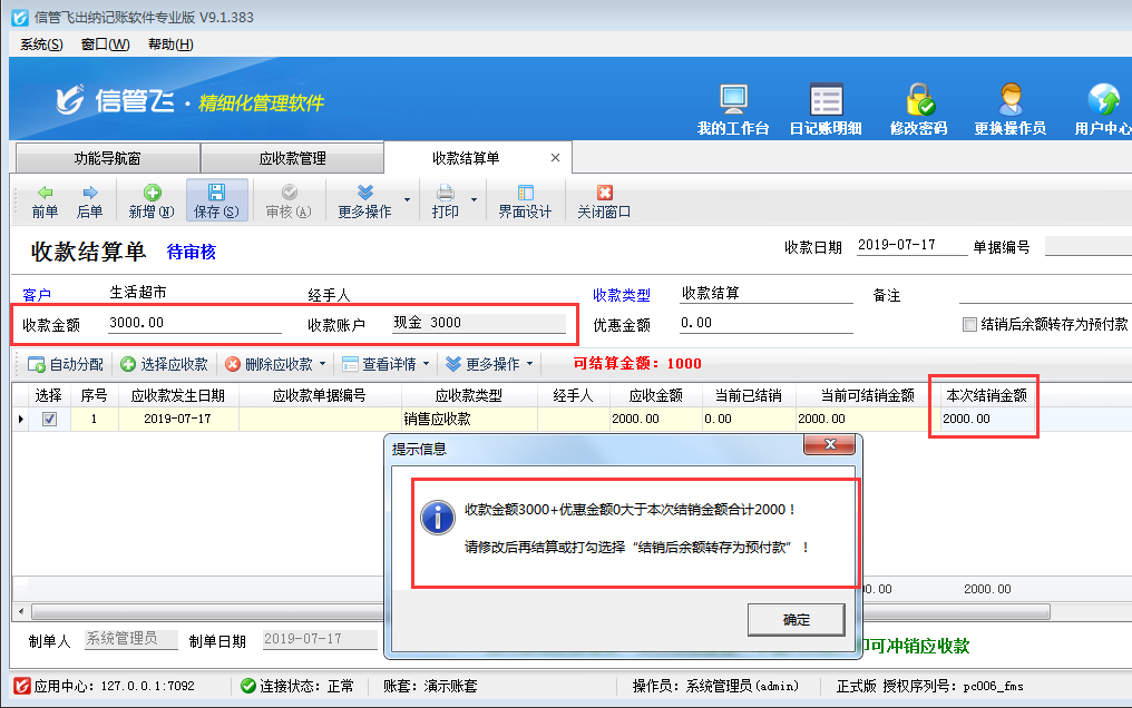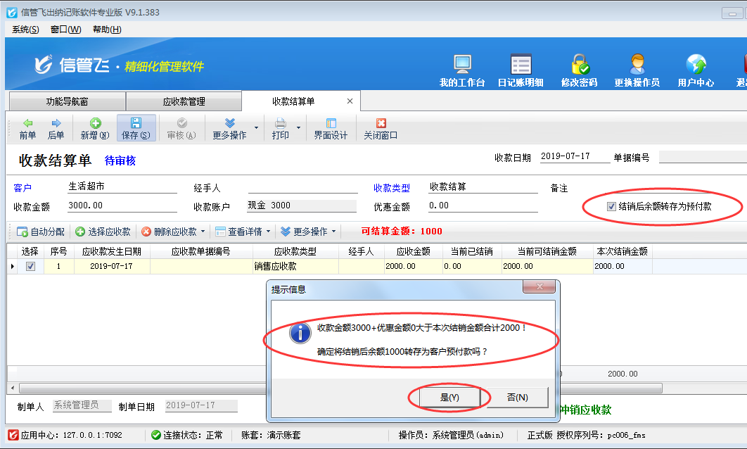 ????在應收款管理界面點擊“收款結(jié)算”按鈕可以打開收款結(jié)算單對應收款進行收款結(jié)算,單據(jù)主體“收款金額”錄入3000元,單據(jù)明細中“本次結(jié)銷金額”錄入2000元,保存收款結(jié)算單時系統(tǒng)提示“收款金額3000+優(yōu)惠金額0大于本次結(jié)銷金額合計2000!........”無法保存成功!