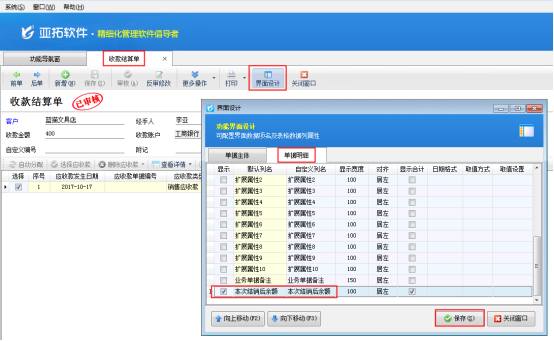 ????在功能導航窗點擊“往來管理”—》“收款結(jié)算單”即可打開“收款結(jié)算單列表”界面,然后打開一個收款結(jié)算單,如圖1所示,點擊“界面設計”,在系統(tǒng)彈出的界面設計窗口點擊“單據(jù)明細”,找到“本次結(jié)銷后余額”數(shù)據(jù)項,勾選此數(shù)據(jù)項后,點擊“保存”按鈕。