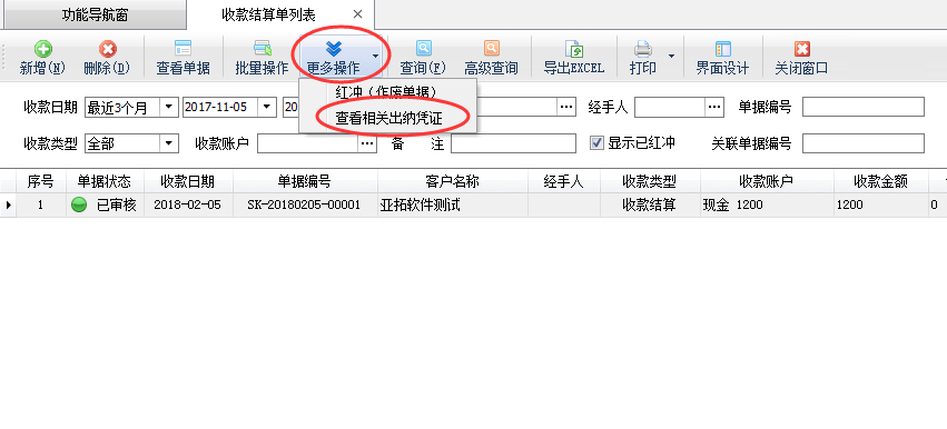 ????在功能導航窗點擊“往來管理”—》“收款結(jié)算單”即可打開收款結(jié)算單列表界面,然后通過工具欄內(nèi)“界面設計”功能可以將“出納憑證字”及“出納憑證號”數(shù)據(jù)項配置顯示出來,可以快速查看到收款結(jié)算單轉(zhuǎn)記的“出納憑證字”及“出納憑證號”,如下圖一所示。然后選中一個存在轉(zhuǎn)記出納憑證記錄的收款結(jié)算單,點擊工具欄中“更多操作”—》“查看相關(guān)出納憑證”按鈕(如圖二所示),即可快速打開相關(guān)出納憑證界面,查看相關(guān)出納憑證詳情(如下圖三所示)。