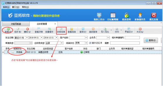 ????在功能導航窗點擊“往來管理”—》“應收款管理”進入應收款管理界面,在應收款管理界面選擇未結(jié)銷的應收款,點擊工具欄的“收款結(jié)算”進行收款操作,如下圖所示: