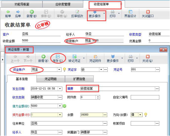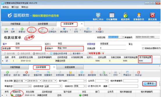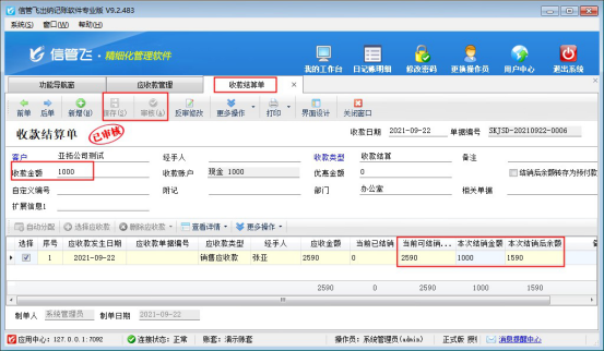 ????選擇應收款后輸入收款金額和本次結(jié)銷金額。保存審核單據(jù)后,未結(jié)銷的應收款會變?yōu)橐呀Y(jié)銷。