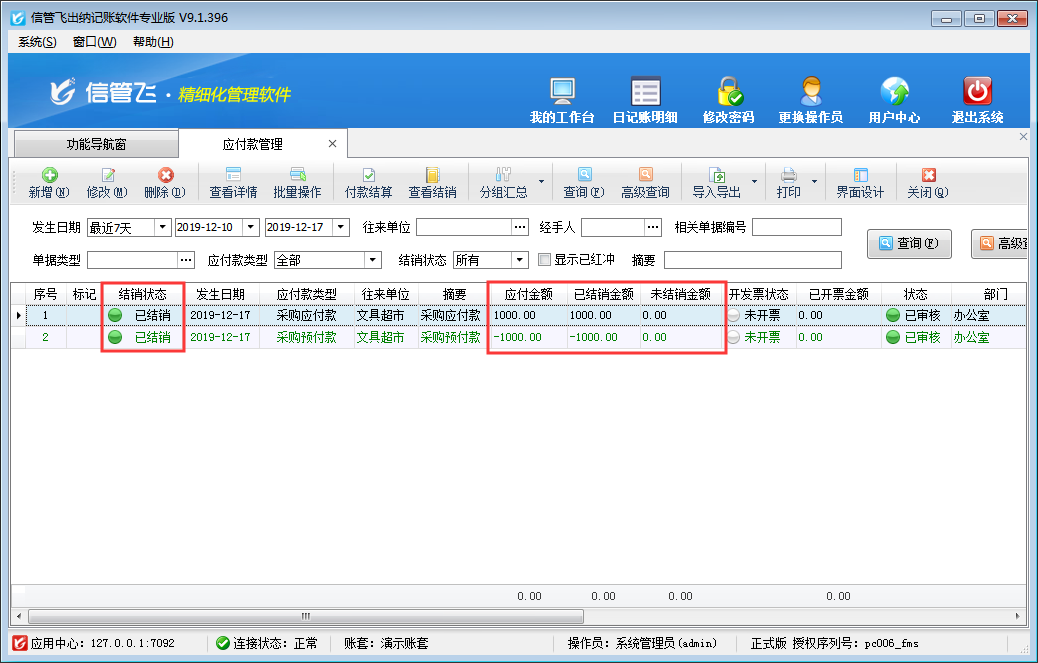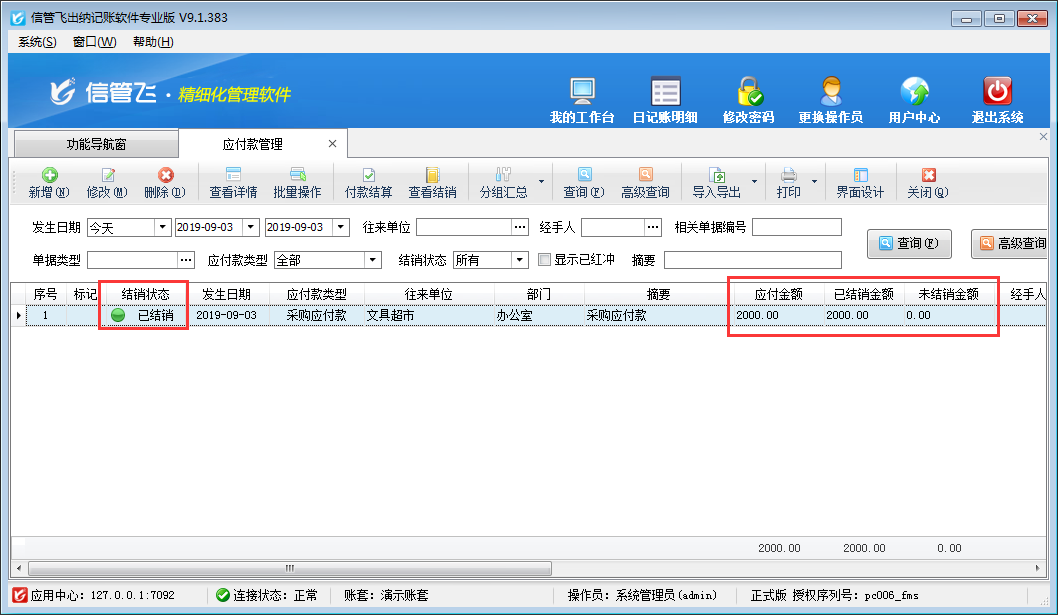 ????付款結(jié)算單單據(jù)審核之后,更新應付款的結(jié)銷狀態(tài),在應付款管理界面可以查看應付款結(jié)銷情況,會由“未結(jié)銷”變?yōu)椤耙呀Y(jié)銷”如下圖所示:
