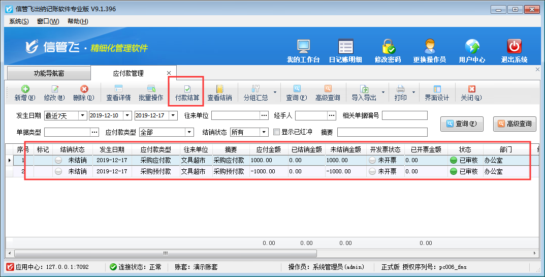 ????信管飛RMS軟件的應付款記錄是根據(jù)開的采購入庫單保存審核后自動生成的,是一一對應的。在功能導航窗點擊“往來管理”—》“應付款管理”可查看單據(jù)生成的應付款記錄,選擇一條未結(jié)銷的應付款,點擊工具欄的“付款結(jié)算”,進行付款結(jié)算操作,如下圖所示: