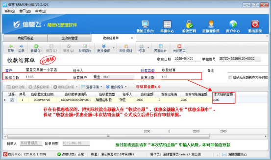 ????如果需要給客戶優(yōu)惠或抹零,可以錄入優(yōu)惠金額,如應收2000元,實際收款1900元,優(yōu)惠了100元,請在收款結(jié)算單單據(jù)主體“收款金額”中錄入1900元,“優(yōu)惠金額”內(nèi)錄入100元,單據(jù)明細中“本次結(jié)銷金額”錄入2000元,保存并審核收款結(jié)算單即可,如下圖所示。