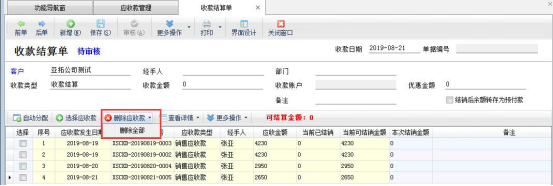 ????彈出“收款結(jié)算單”界面,默認是顯示所有的未結(jié)銷的應收款,如需要只結(jié)銷部分應收款(示例結(jié)銷2019-8-19的應收款),有以下兩種方法: