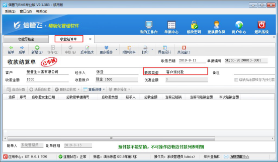 ????信管飛RMS軟件星光版、標準版、專業(yè)版都支持錄入客戶預付款,客戶預付款是客戶付定金給我們,在客戶實際發(fā)貨后會收回應收款,此時軟件收款結(jié)算中支持應收款可以抵消之前的預付款,本文以“信管飛RMS專業(yè)版”為例,示范下應收款如何抵消客戶預付款?