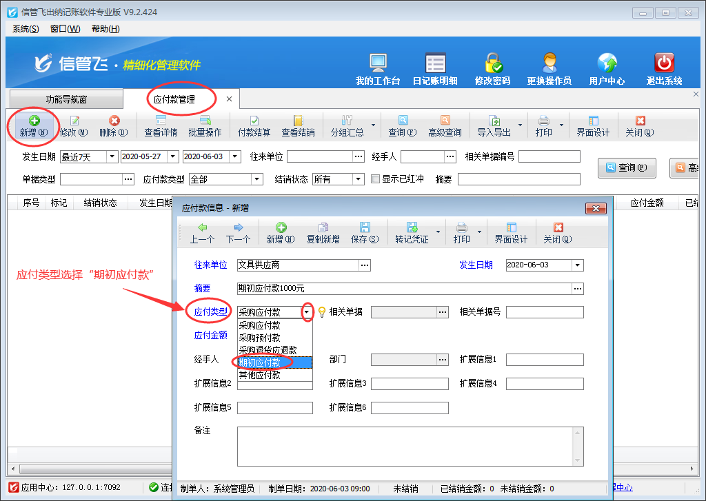 ????在功能導航窗點擊“往來管理”—》“應付款管理”,即可打開應付款管理界面,在工具欄點擊“新增”按鈕,系統(tǒng)打開新增應付款窗口,如下圖所示,“應付類型”選擇為“期初應付款”,然后錄入應付金額及其他數(shù)據(jù)后保存此應付款信息即可。