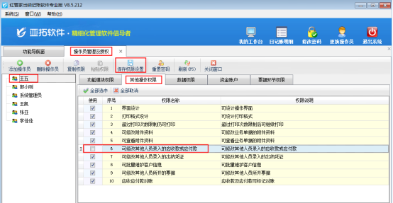 ????在功能導航窗點“系統(tǒng)管理”→“操作員及授權(quán)”即可進入“操作員管理及授權(quán)”界面,選中操作員賬號,在“其他操作權(quán)限”界面將“可修改其他人員錄入的應收款或應付款”權(quán)限打鉤取消,如下圖1所示,設置操作員賬號“王五”不可修改其他人員錄入的應收款或應付款。