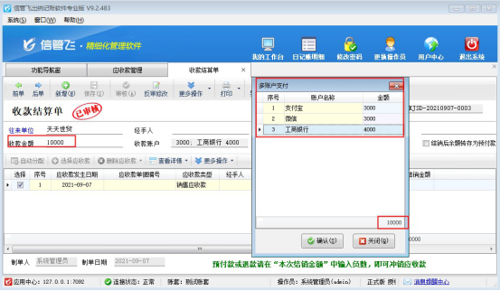????收款結(jié)算單用來登記收款信息(收款對象即客戶、收款賬戶、收款金額、經(jīng)手人等),并結(jié)銷應收款記錄。正常情況下,應收金額為多少,即客戶支付我們多少貨款,但是部分情況下客戶支付給我們貨款時會多支付一些作為預付款,這種情況下該如何開收款結(jié)算單,本篇文章我們以信管飛出納記賬軟件為例演示一下操作步驟。