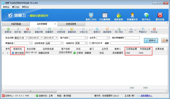 ????審核收款結(jié)算單后,返回至應收款管理界面,點擊“查詢”刷新,可看到結(jié)銷狀態(tài)由“未結(jié)銷”變?yōu)椤安糠纸Y(jié)銷”,對應的已結(jié)銷金額變?yōu)?000元,未結(jié)銷金額為剩余的1590元,如下圖所示: