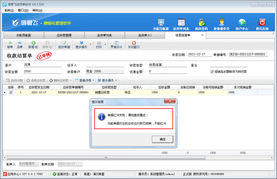 ????應收、應付賬款管理是現(xiàn)代企業(yè)資金管理的重要組成部分,其管理效果的好壞直接影響到企業(yè)經(jīng)營的成敗,信管飛RMS、信管飛出納記賬軟件及信管飛送貨單軟件均支持管理往來賬款,如果應收款結(jié)銷后發(fā)現(xiàn)收款結(jié)銷錯誤,系統(tǒng)支持紅沖并刪除收款記錄,部分用戶在紅沖收款結(jié)算單時會出現(xiàn)如下圖提示:收款結(jié)算單紅沖失敗,當前單據(jù)對應的應收應付款已結(jié)銷,不能紅沖!