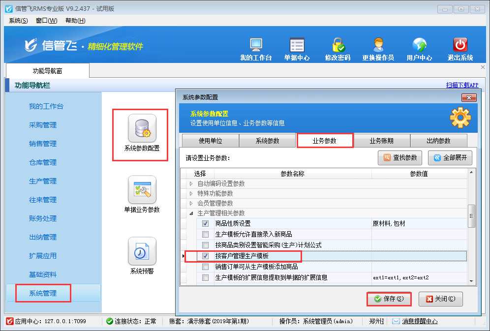 ????在功能導(dǎo)航窗點擊“系統(tǒng)管理”—》“系統(tǒng)參數(shù)配置”—》“業(yè)務(wù)參數(shù)”打開業(yè)務(wù)參數(shù)配置界面,然后在生產(chǎn)管理相關(guān)參數(shù)中打鉤啟用“按客戶管理生產(chǎn)模板”參數(shù),然后點擊“保存”按鈕保存參數(shù)配置,如下圖所示。