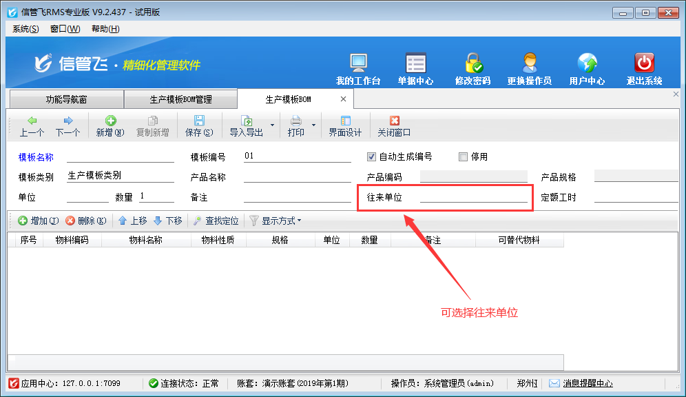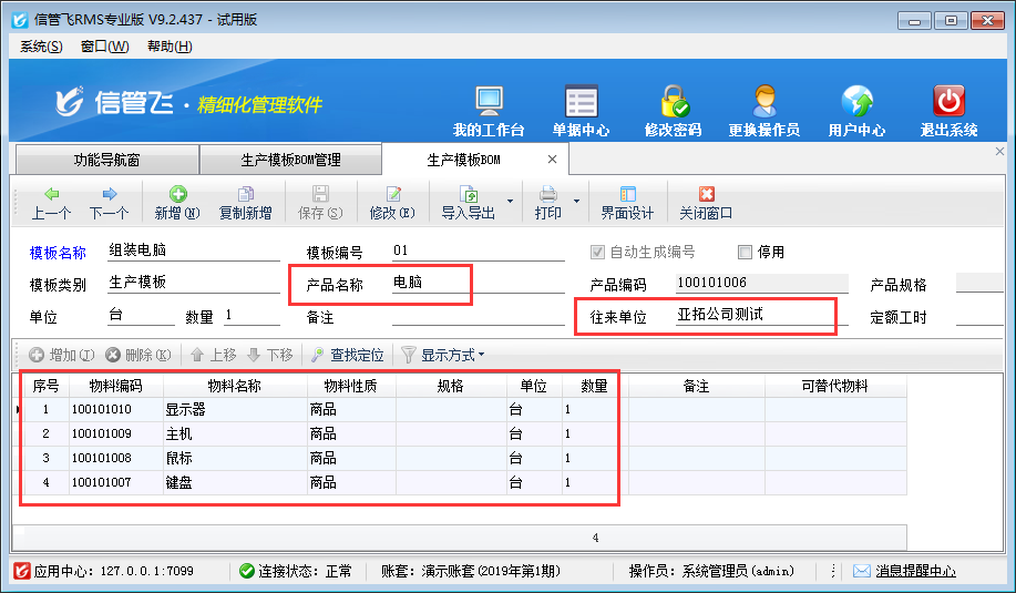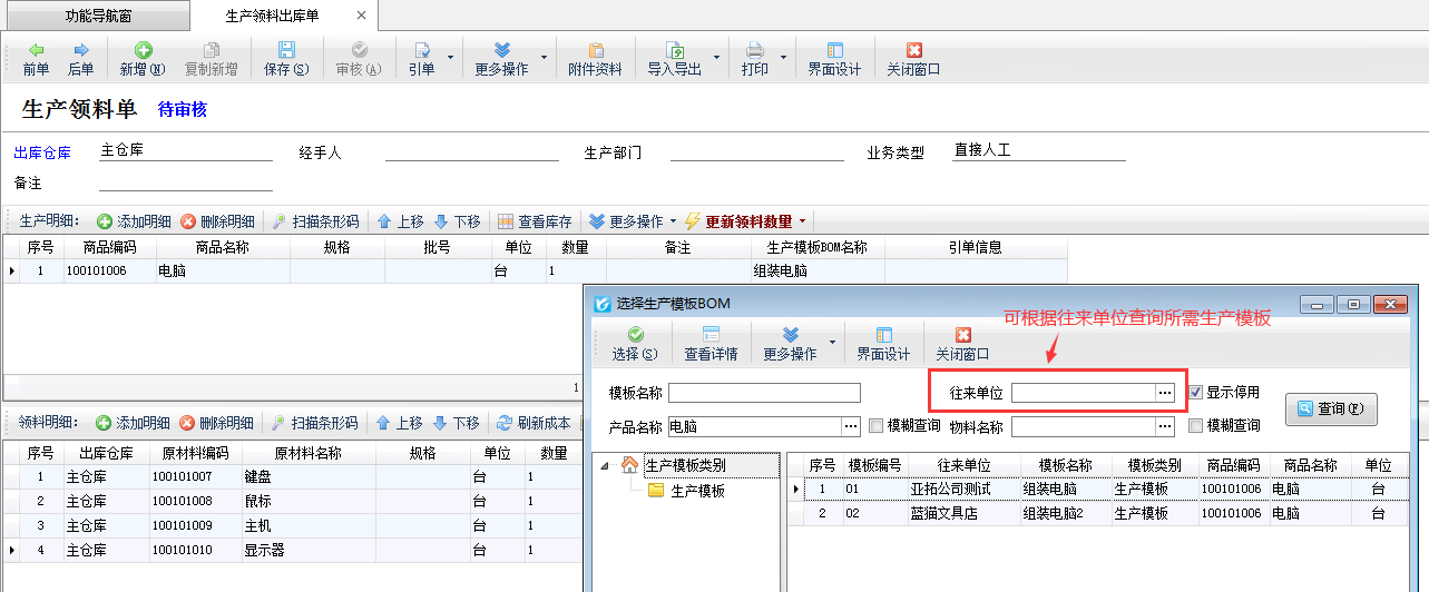 ????參數(shù)配置完成之后,打開生產(chǎn)管理模塊,重新新增生產(chǎn)模板BOM表時,即可選擇往來單位,如下圖所示,在給“亞拓公司測試”、“藍貓文具店”兩家客戶生產(chǎn)同樣的產(chǎn)品“電腦”時設(shè)置的不同的生產(chǎn)模板,所需的原材料不同。