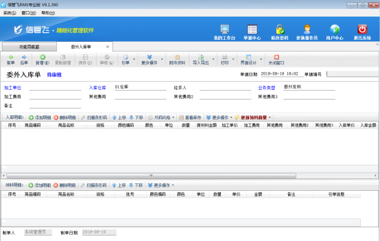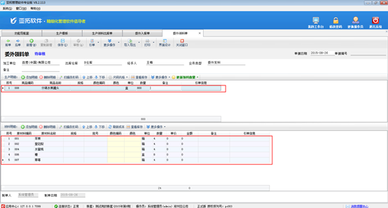 ????(2)當(dāng)需要加工廠進行加工時,開“委外加工單”錄入加工任務(wù),軟件會根據(jù)生產(chǎn)模板自動算出需要的原材料明細(xì)。