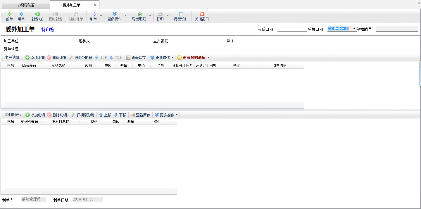 ????委外加工明細(xì):可以通過引用銷售訂單或生產(chǎn)計劃單的方式,快速錄入加工產(chǎn)品明細(xì)。
