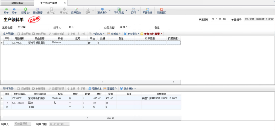 ????單據(jù)明細(xì):引用或輸入生產(chǎn)商品明細(xì)后,只需要錄入“數(shù)量”,其他數(shù)量由后續(xù)業(yè)務(wù)單據(jù)引用生成任務(wù)單后,自動更新。