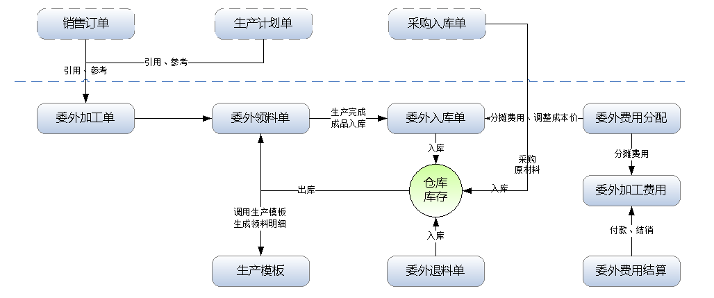 ????實際的企業(yè)生產(chǎn)業(yè)務(wù)中經(jīng)常會涉及委外代加工業(yè)務(wù),有時候需要委托外部工廠幫我們生產(chǎn)一些配件,有時候需要幫忙生成半成品,然后委外生產(chǎn)的成品或半成品,再進入我們車間進行再加工(如包裝封箱、或二次加工等)。專業(yè)版及以上版本可以購買 “委外加工管理”擴展功能模塊來管理此業(yè)務(wù)。
