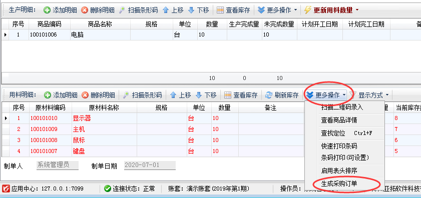 ????點擊“用料明細(xì)”工具欄“更多操作”—》“生成采購訂單”即可將原材料建議采購量直接生成采購訂單便于采購人員進行采購,如下圖所示。