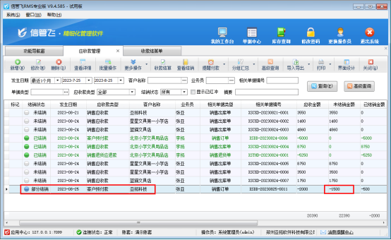 信管飛RMS軟件是集采購管理、銷售管理、倉庫管理、往來應(yīng)收應(yīng)付款管理為一體的軟件,軟件支持登記客戶預(yù)付款,客戶下單前可先支付定金,有用戶咨詢上月的預(yù)付款還未結(jié)銷需要退回一部分,軟件中該如何操作?本文以信管飛RMS軟件為例進(jìn)行示范下。 演示視頻觀看鏈接:客戶預(yù)付款需要退回部分,如何操作? 方式一:軟件不需要體現(xiàn)退款記錄,可直接打開銷售訂單修改預(yù)收定金金額為1500元,如下圖所示: 方式二:對客戶預(yù)付款記錄進(jìn)行結(jié)算操作。