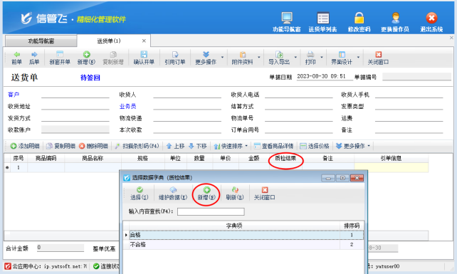 信管飛系列軟件開單界面均支持自定義設(shè)計顯示數(shù)據(jù)項(xiàng)。軟件除了默認(rèn)顯示的數(shù)據(jù)項(xiàng)外,可以額外添加擴(kuò)展數(shù)據(jù)項(xiàng),擴(kuò)展信息數(shù)據(jù)項(xiàng)支持設(shè)置取值方式,如果擴(kuò)展字段內(nèi)容是固定的,可以設(shè)置為選擇錄入,可大大提高開單效率,本文以“信管飛送貨單軟件”為例,示范下如何設(shè)置擴(kuò)展信息可選擇錄入? 示例:送貨單添加擴(kuò)展信息1(質(zhì)檢結(jié)果),擴(kuò)展信息內(nèi)容固定為:合格或不合格 演示視頻觀看鏈接:如何設(shè)置擴(kuò)展信息可選擇錄入? 功能導(dǎo)航窗選擇“