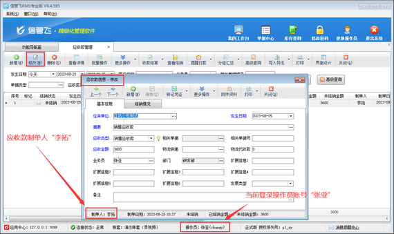 演示視頻觀看鏈接:修改應(yīng)收款時(shí)提示“當(dāng)前記錄為其它操作員錄入的,您沒有權(quán)限修改!”如何解決演示視頻 有用戶在修改應(yīng)收款時(shí),會遇到無法修改的情況,系統(tǒng)彈出提示信息“當(dāng)前記錄為其它操作員錄入的,您沒有權(quán)限修改!”,如下圖所示。 出現(xiàn)此問題的原因是,當(dāng)前登錄的操作員賬號沒有修改其他人員錄入的應(yīng)收應(yīng)付款權(quán)限,解決方法如下:使用系統(tǒng)管理員賬號登錄軟件,在功能導(dǎo)航窗點(diǎn)擊“系統(tǒng)管理”—“操作員及授權(quán)”打開操作員管理及授權(quán)界面,選擇操作員賬號,在“其他操作權(quán)限”界面將“可修改其他人員錄入的