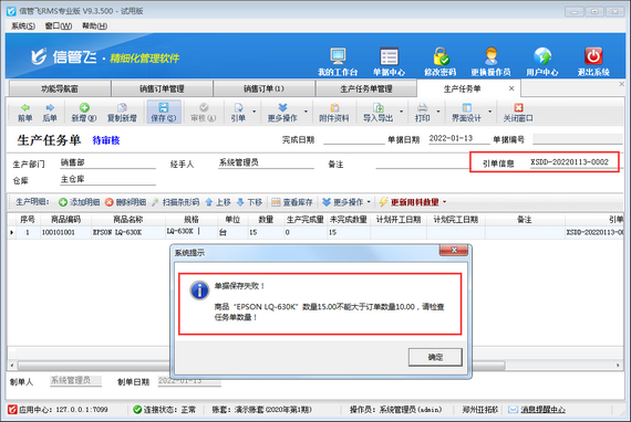 生產任務單,即生產過程中的任務加工單,用于執行生產計劃,進入實際生產階段。生產任務單支持引用銷售訂單及生產計劃單進行開單下達生產任務數量,本篇文章介紹一下生產任務單引用銷售訂單開單的情況下,如何設置生產任務單數量不可大于銷售訂單數量? 在功能導航窗點擊“系統管理”—》“系統參數配置”—》“業務參數”打開業務參數配置界面,在生產管理相關參數中打鉤啟用“生產任務單數量不可大于銷售訂單數量”參數,如下圖所示。 參數配置完成之后,新開一個銷售訂單,如下圖所示。