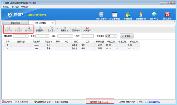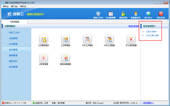 信管飛出納記賬軟件內支持計件工資管理功能,可以對公司內部根據計件進行核算工資的員工工資進行管理,本篇文章介紹一下出納記賬軟件內如何設置操作員不可維護計件工資模板? 在功能導航窗點擊“系統管理”—》“操作員及授權”,打開操作員管理及授權界面,選擇操作員“張亞”,在其右側的功能模塊權限內選擇“綜合管理”模塊,將“計件工資模板”的“新增、修改、刪除”權限勾選取消,然后保存設置,如下圖所示。 操作員權限設置完成后,關閉當前窗口,更換操作員“張亞”登錄軟件,打開“綜合管理”—》“計件工資管理”界