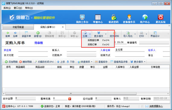 信管飛RMS(進銷存管理軟件)支持根據銷售訂單進行采購入庫進貨(如下圖所示),同時也支持配置操作員采購入庫單引用銷售訂單開單權限,本篇文章介紹一下進銷存管理軟件內如何設置操作員開采購入庫單不可引用銷售訂單? 在功能導航窗點“系統管理”—》“操作員及授權”即可進入“操作員管理及授權”界面,選中操作員賬號,在“其他操作權限”界面將“采購入庫單可引用銷售訂單”權限打鉤取消,然后保存權限設置,如下圖所示,設置操作員張亞沒有“采購入庫單可引用銷售訂單”權限。 設置完成后,我們使用操作員賬號登錄軟
