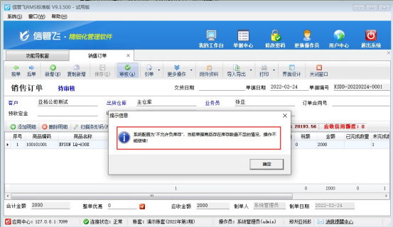 信管飛RMS軟件、信管飛倉庫管理軟件支持管理商品庫存,商品進出庫單據審核后庫存自動增減,默認開單允許負庫存出庫,有用戶需要下銷售訂單時負庫存無法下單的情況,本文以“信管飛RMS軟件”,示范下如何設置銷售訂單負庫存不能審核。 在功能導航窗點擊“系統管理”—》“系統參數配置”選擇“業務參數”,找到參數“銷售訂單審核允許負庫存”取消勾選,然后保存配置,如下圖所示: 參數設置完成后,功能導航窗點擊“銷售管理”,打開銷售訂單新增界面,選擇選擇一個無庫存的商品,