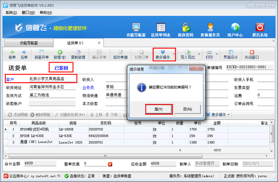 信管飛送貨單軟件是一款針對中小型企業(yè)開發(fā)的集送貨管理、應收款管理等為一體的送貨單打印軟件。使用軟件時如果送貨單確認開單后,發(fā)現(xiàn)客戶名稱有誤,系統(tǒng)不支持直接修改,那么該如何處理呢? 送貨單支持復制新增功能,可以選擇已確認開單的送貨單進行復制新增生成一個一模一樣的新單據(jù)。如下圖所示: 復制新增之后,可以對新單據(jù)修改客戶名稱。如下圖所示: 新單據(jù)開單后,需要對原單據(jù)進行刪除。點工具欄中的“更多操作”—》“刪除單據(jù)”和“紅沖單據(jù)”,可以對單據(jù)進行紅沖及刪除。
