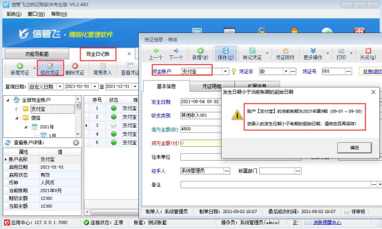 出納記賬軟件可登記日記賬,當本期(即本月)的業(yè)務已審核處理完畢,為避免后期打開修改造成數(shù)據(jù)不對的情況,軟件支持鎖定賬期,軟件可通過結賬處理,結賬后會自動進入下一賬期,已結賬的賬期憑證不允許修改,本文進行示范下如何操作? 在功能導航窗,點擊“出納管理”——》“出納期末結帳”,進入“出納期末結帳”界面,選擇賬戶名稱“支付寶”,可看到當前賬期是2021-8月,如下圖所示: 對資金賬戶“支付寶”進行結賬處理,選擇賬戶名稱為“支付寶”的記錄,點擊工具欄的“結賬”按鈕,系統(tǒng)