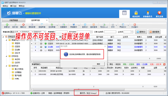 在商貿流通領域,送貨單作為貨物交接的核心憑證,其簽收與回執流程直接影響企業資金流轉效率與風險管控能力。信管飛送貨單軟件以智能化流程管理為核心,通過“待簽回-已簽回-已結賬”三階狀態控制,實現貨物交付全鏈路可視化追蹤,更以精細化權限管理功能,為企業筑牢運營安全防線。 針對多角色協作場景,信管飛送貨單軟件創新推出操作權限分級機制。企業可根據崗位職責靈活配置權限,例如禁止基層操作員執行簽回、過賬等核心操作,從源頭規避人為失誤或違規風險。這一設計既保障了財務數據的嚴謹性,又賦予一線員工高效處理業務的自主權,實現效率與安全的平衡。