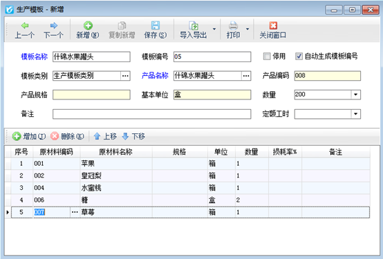 刪除模板:在生產模板界面點工具欄中的“刪除”按鈕,可以刪除生產模板記錄。如果生產模板已經使用過(在開生產領料出庫單中使用過)則無法刪除。