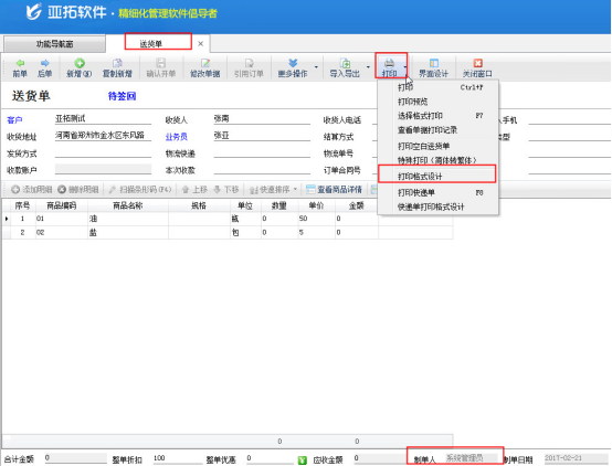 以送貨單軟件為例,選擇一個(gè)送貨單單據(jù),選擇“打印”—》“打印格式設(shè)計(jì)”—》“設(shè)計(jì)格式”進(jìn)入打印模板設(shè)計(jì)器頁(yè)面,如下圖1、圖2所示: