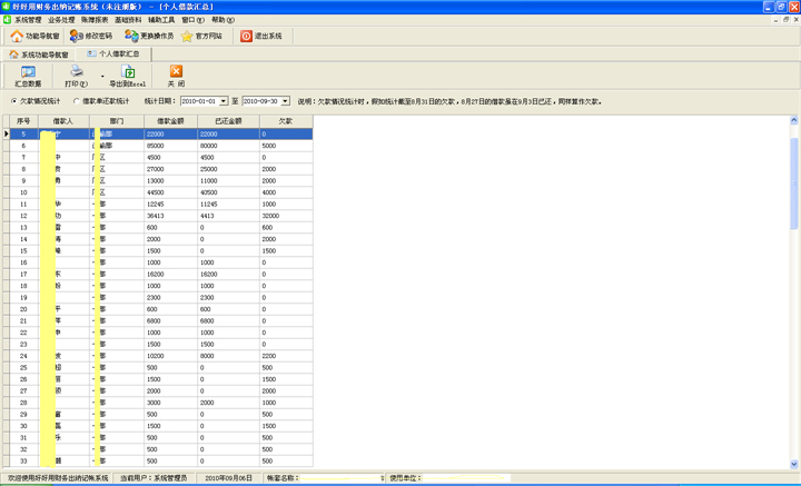 好好用財務出納記賬系統發布V2.6(Build 374)下載地址:http://www.uzaiuzai.com/download/FPSetup_Msde.exe更新內容:(2010-09-06)1、解決英文操作系統或未采用默認日期格式,比如日期間隔符采用/(2010/9/6)時,新增憑證、新增應收應付款時報錯的問題。2、個人借款統計,增加欠款統計功能,此功能與個人借款匯總功能的不同在于:欠款情況