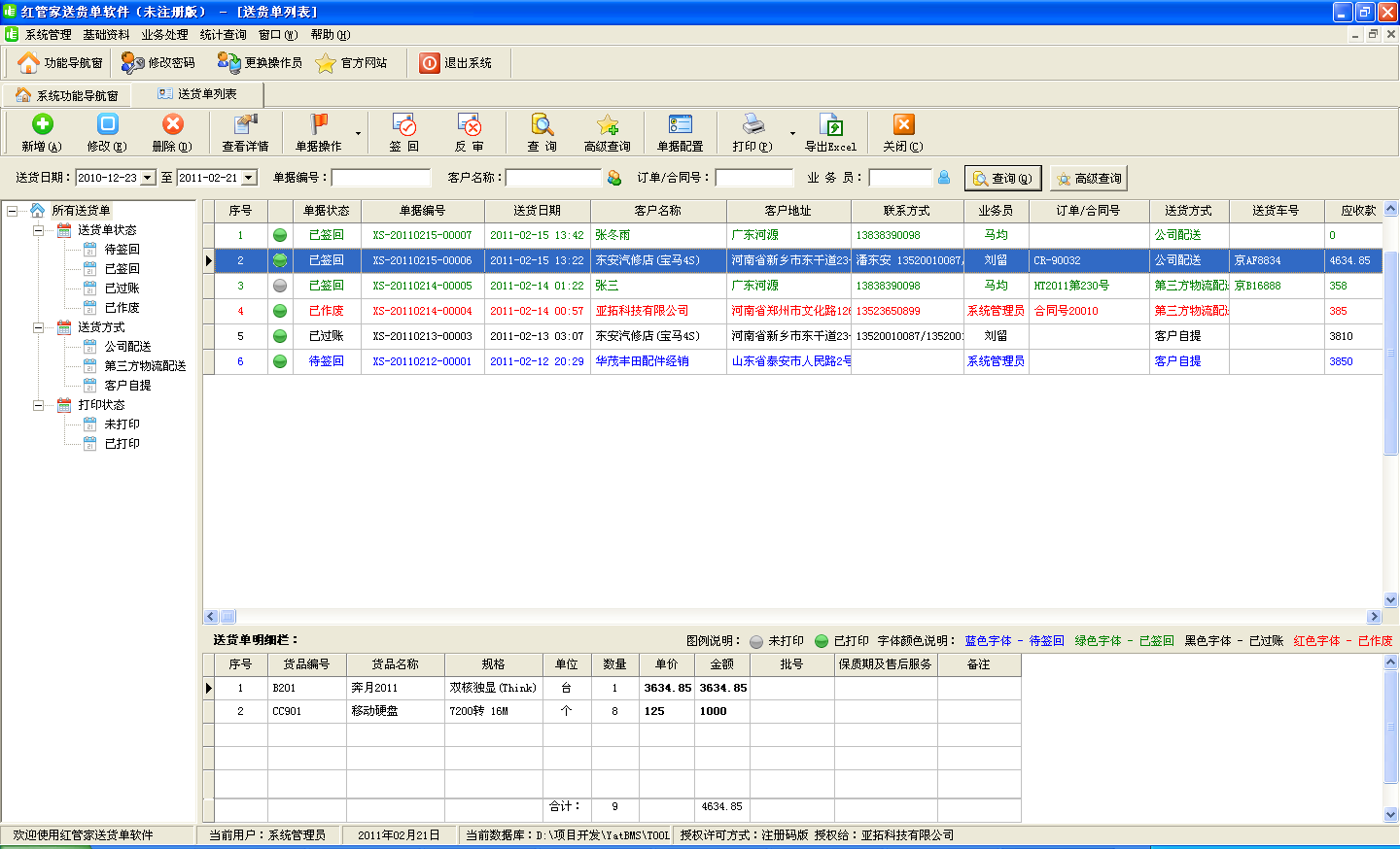 系統主要功能:紅管家送貨單軟件是一款針對中小型企業開發的集送貨管理(發貨管理)、銷售收款(應收款管理)等功能為一體的送貨管理軟件。軟件具有程序輕盈,運行穩定的特點,是廣大店鋪/商鋪/賣場柜臺/銷售型公司快速實現企業管理信息化的首選軟件!通過本軟件提供的發貨管理和收款結算管理功能,讓您輕松告別手工開單、人工結算時代,高效、科學、準確的實現業務管理的無紙化和信息化!主要特點:1、實現送貨與銷售應收款的