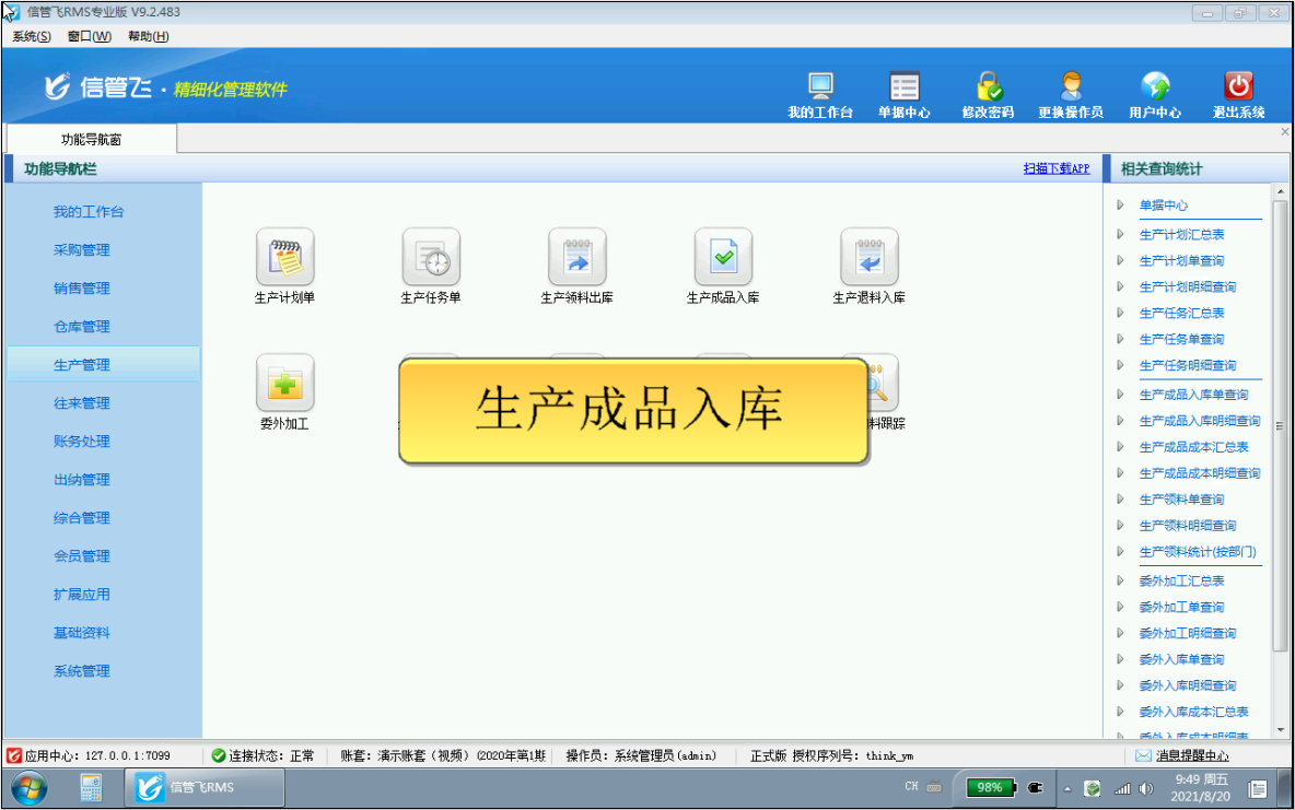 介紹信管飛RMS生產(chǎn)成品入庫單的主要功能和操作步驟。